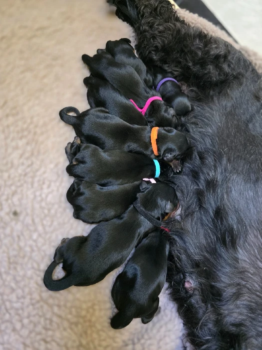 Nu har dom anlänt! 4tikar 🩷🩷🩷🩷och 5hanar🩵🩵🩵🩵🩵. Allt har gått bra med både mor och valpar. Det startade kl03 och var klart kl10.